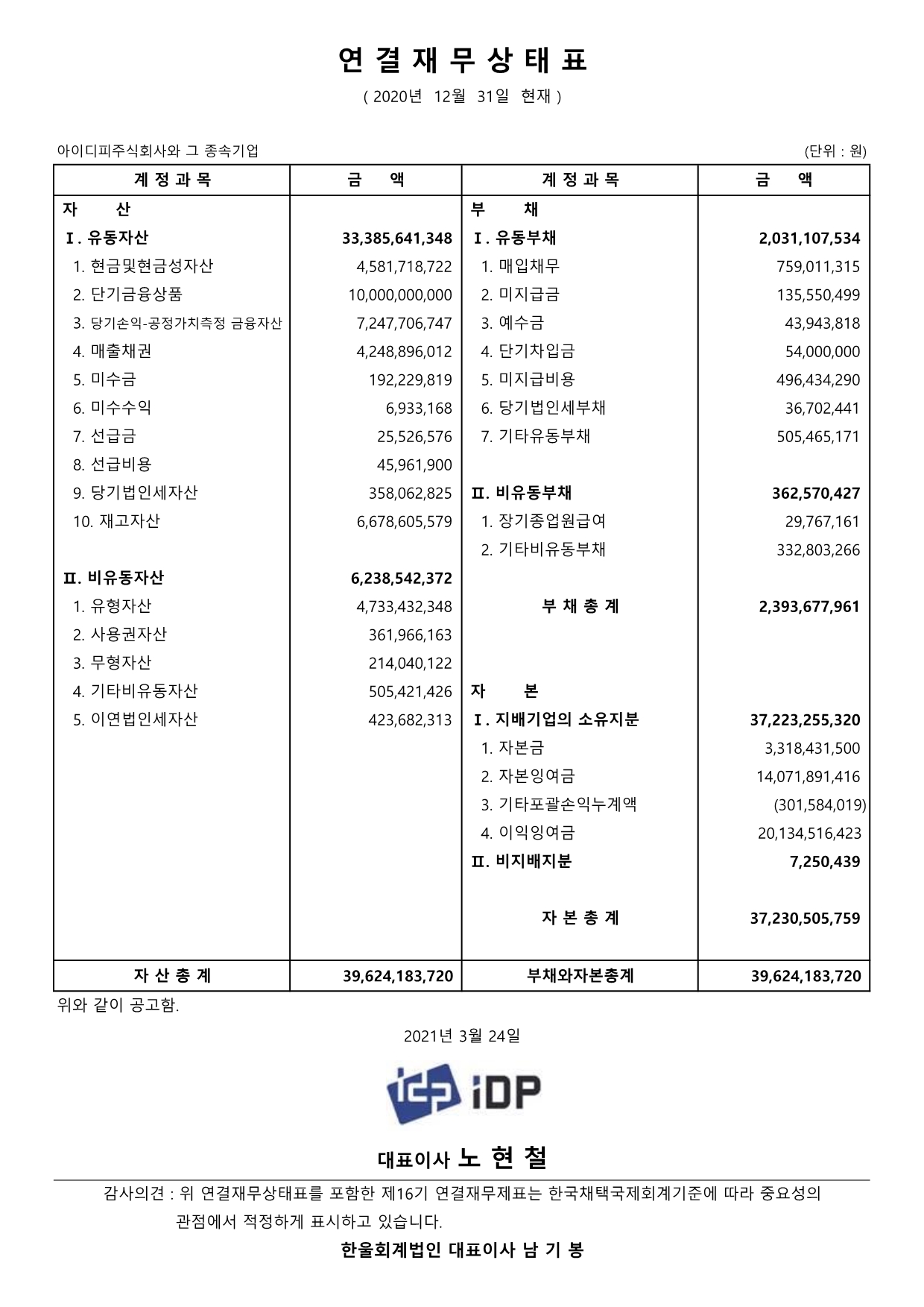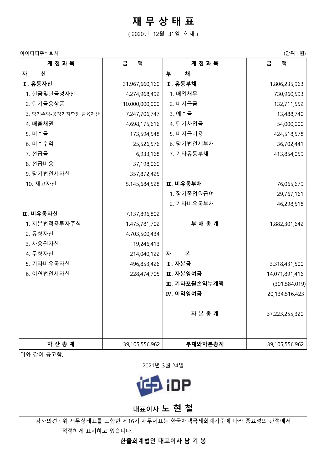 제16기(2020년) 결산공고